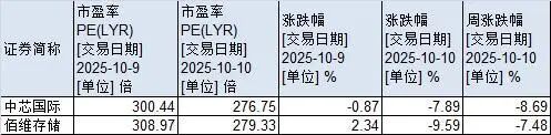 Wind数据显示,本周两个交易日,中芯国际、佰维存储分别累计下跌8.69%、7.48%,这些股票的静态市盈率随着股价调整而有所下降。截至10月10日收盘,中芯国际、佰维存储静态市盈率分别为276.75倍、279.33倍。而截至10月9日收盘,中芯国际的市盈率为300.44倍,佰维存储的市盈率为308.97倍。